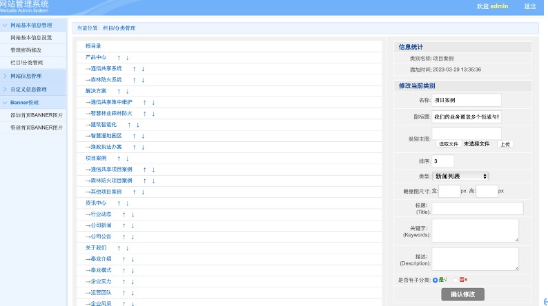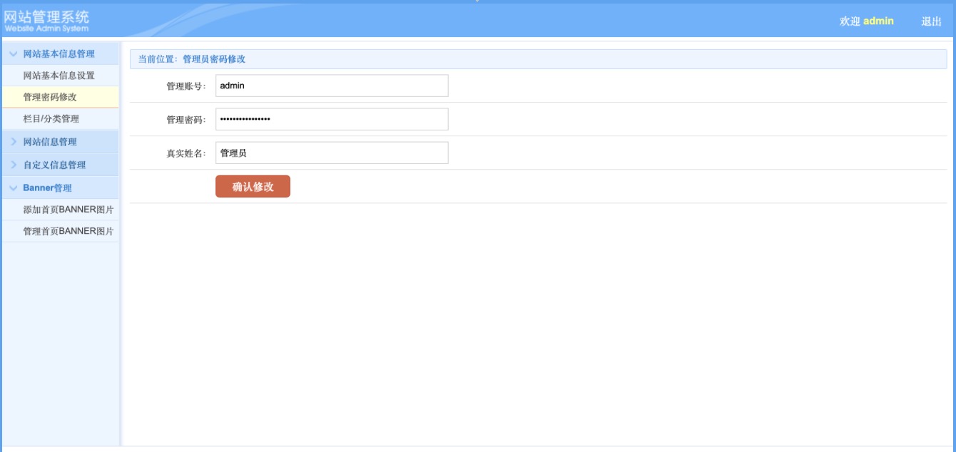 2.網(wǎng)站基本信息管理:網(wǎng)站基本信息管理包含網(wǎng)站基本信息設(shè)置、管理密碼修改、欄目/分類(lèi)管理。