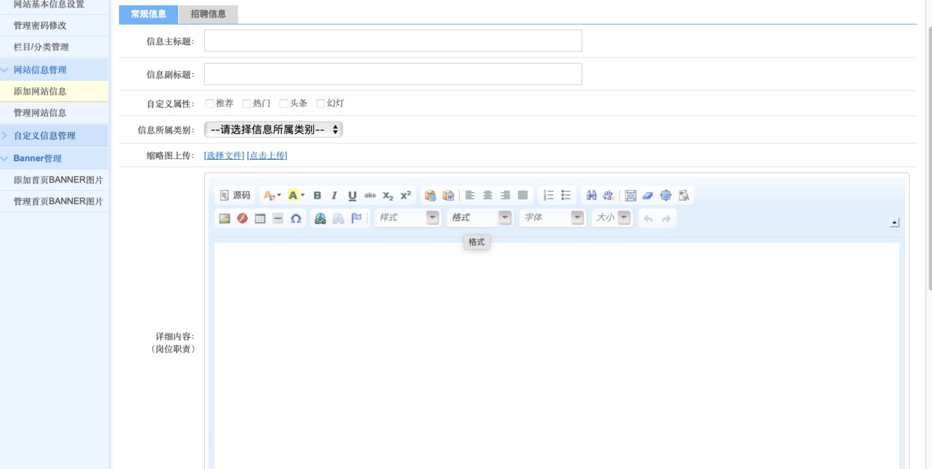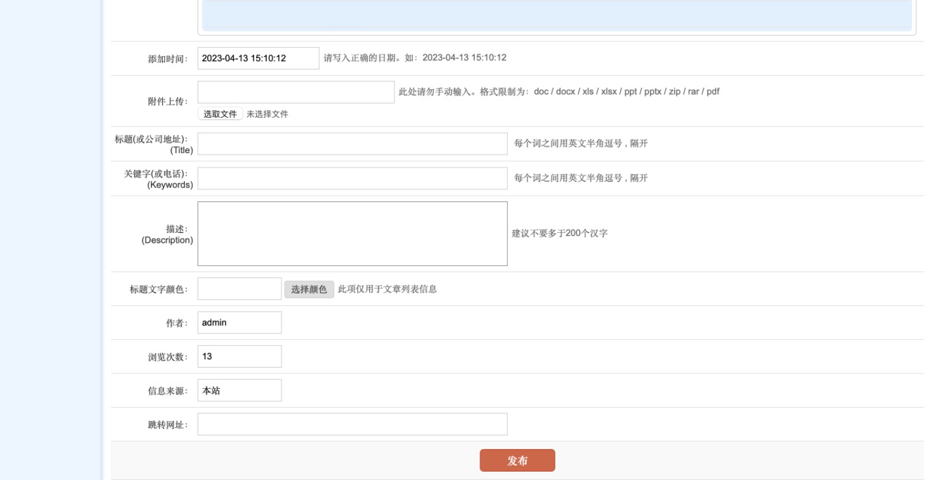 說(shuō)明:填寫(xiě)標(biāo)題后選擇信息所屬類(lèi)別,上傳縮略圖先選擇文件后再點(diǎn)擊上傳。在編輯框內(nèi)將信息編輯好了可繼續(xù)編輯時(shí)間、附件TDK【Title、Description、Keywords】等信息,記得一定要點(diǎn)擊發(fā)布,否則不會(huì)上傳成功。