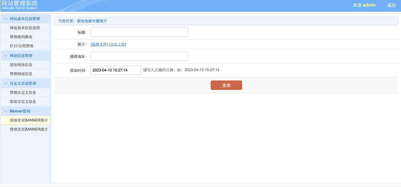 說(shuō)明:可修改和刪除,修改點(diǎn)擊后進(jìn)入修改,修改完畢后點(diǎn)擊發(fā)布即可生效,刪除后確認(rèn)即可刪除【不要輕易刪除首頁(yè)BANNER圖】。