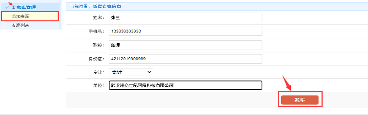4.3、專家錄入:專家屬性:姓名、手機(jī)號、職稱、身份證、專業(yè)、單位(可自定義)。