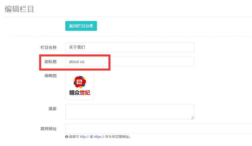 在后臺中找到 欄目管理 -> 編輯欄目 -> 欄目名稱-> 副標題