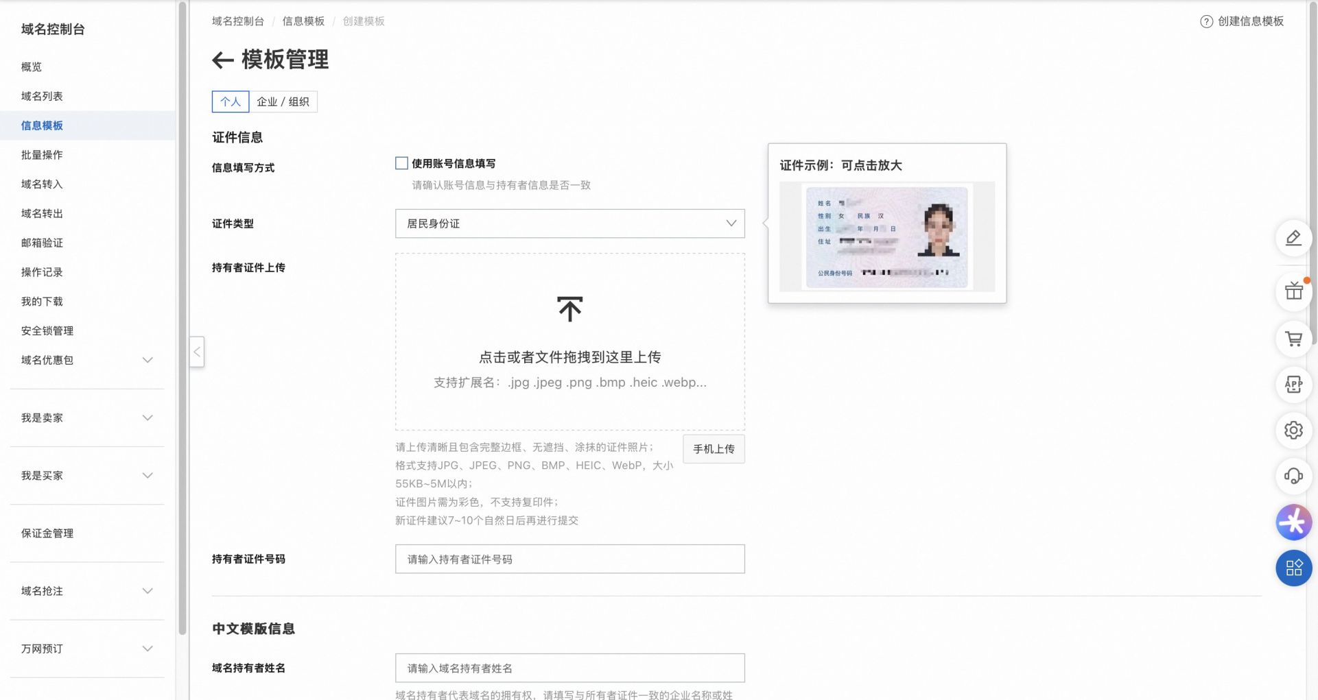 第二步:創(chuàng)建域名模板,以個人名義注冊還是以公司名義注冊,然后將對應(yīng)的信息錄入,等待審核通過即可使用,如下圖: