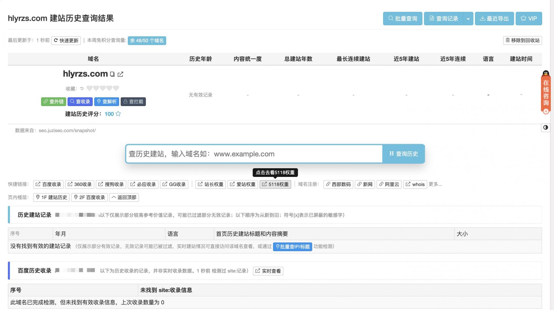 第四步:查詢可注冊域名歷史記錄。這一步很重要,但被很多人忽略了,如果歷史記錄不清白的話,網(wǎng)站上線不容易被收錄或者不被收錄,別人就不容易搜到了。如圖: