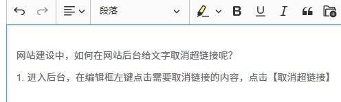 1. 進(jìn)入后臺(tái),在編輯框左鍵點(diǎn)擊需要取消鏈接的內(nèi)容,點(diǎn)擊【取消超鏈接】