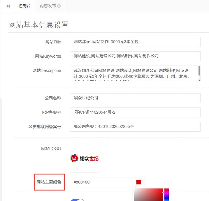 1. 進(jìn)入后臺(tái),點(diǎn)擊【控制臺(tái)】,找到網(wǎng)站主題顏色并吸取想要的網(wǎng)站主題顏色