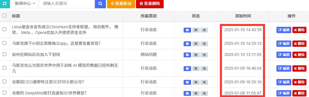 3.顯示所有新聞中心內(nèi)容,選取要排序的新聞,將時(shí)間改成最新時(shí)間,時(shí)間越近,排名越前