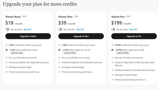 針對不同用戶和不同需求,Manus提供三種付費(fèi)訂閱計(jì)劃,定價分別為每月19美元、39美元或199美元,以提供更多訪問權(quán)限、額外功能和優(yōu)先服務(wù)。
