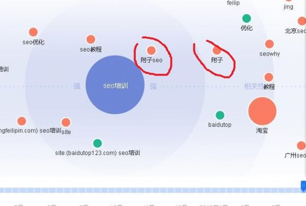 圓形圈起來(lái)的,在圖譜中存在的時(shí)間比較短,來(lái)回動(dòng)一下橫條的時(shí)間表查看,這幾個(gè)站沒(méi)有任何排名。而三角形指出來(lái)的幾個(gè)域名卻長(zhǎng)期存在于需求圖譜中,拉動(dòng)橫條可以看到這幾個(gè)域名雖然位置變動(dòng)了,但是依然存在靠中心的位置,這幾個(gè)站一直排在SEO培訓(xùn)首頁(yè)。